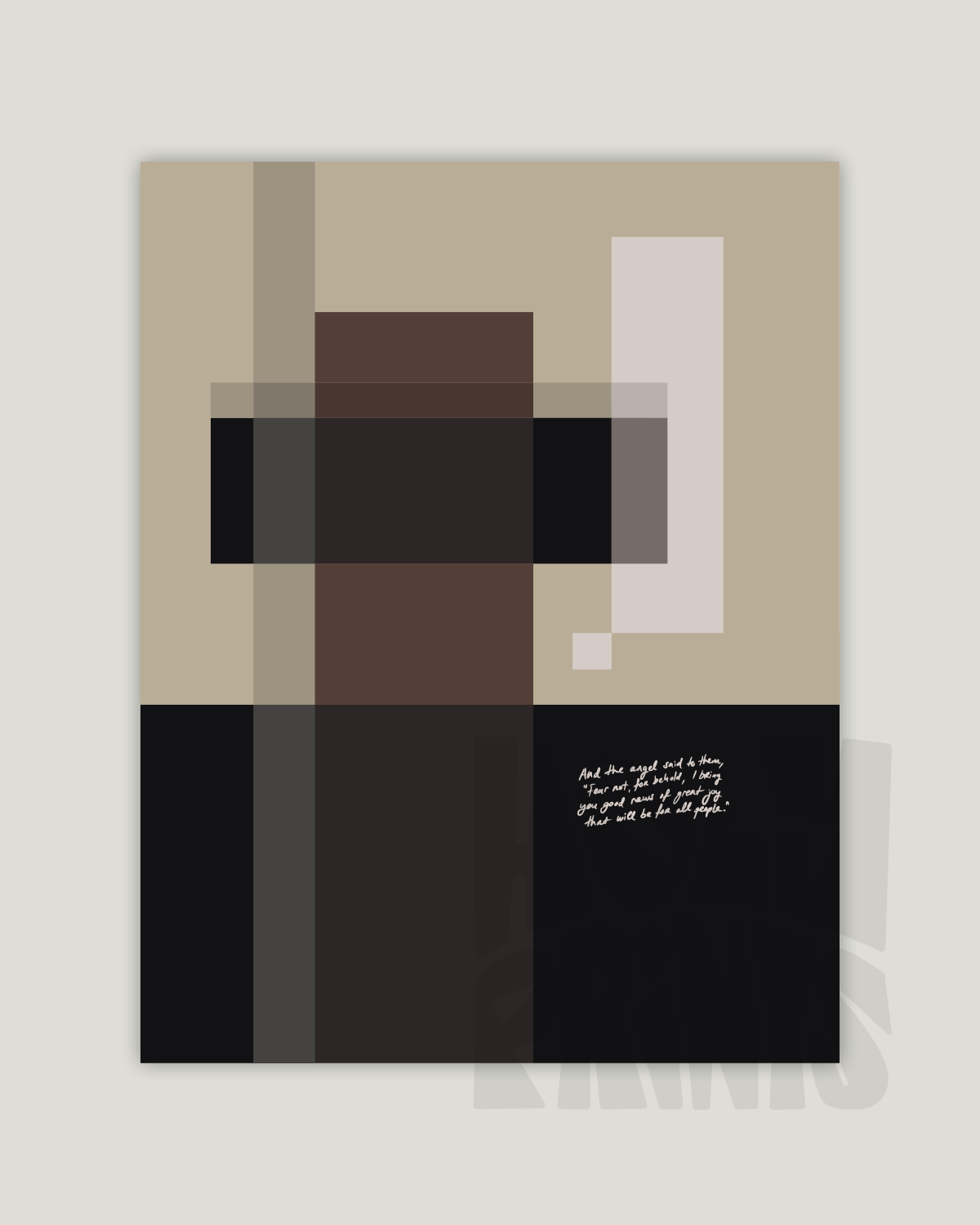 Featuring modern abstract color planes in black and brown and the handwritten scripture: “Fear not, for behold, I bring you good news of great joy that will be for all people.” from Luke 2:10.